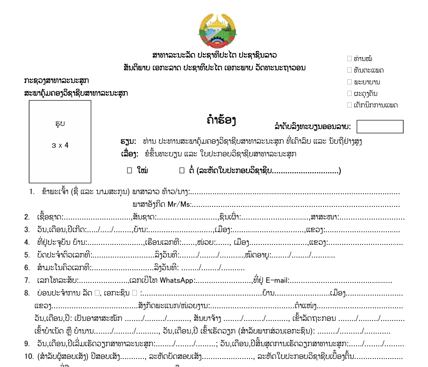 ຄໍາຮ້ອງຂໍຂຶ້ນທະບຽນ ແລະ ໃບປະກອບວິຊາຊີບສາທາລະນະສຸກ