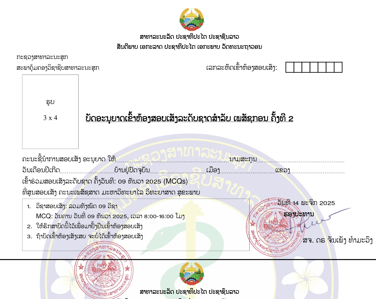 ບັດອະນຸຍາດເຂົ້າຫ້ອງສອບເສັງລະດັບຊາດສໍາລັບ ເພສັຊກອນ ຄັ້ງທີ 2