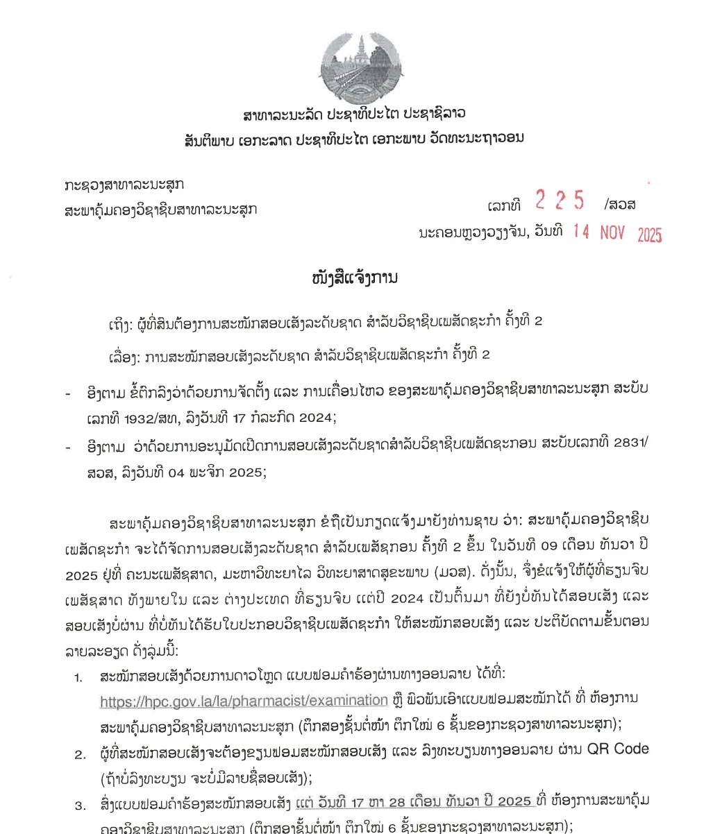 ແຈ້ງການ ການສະໝັກສອບເສັງລະດັບຊາດ ສຳລັບວິຊາຊີບເພສັດຊະກໍາ ຄັ້ງທີ 2