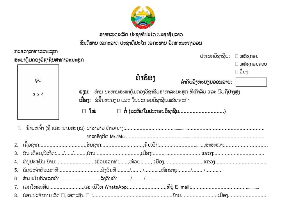ຟອມຂໍໃບປະກອບວິຊາຊີບເພສັດຊະກໍາ